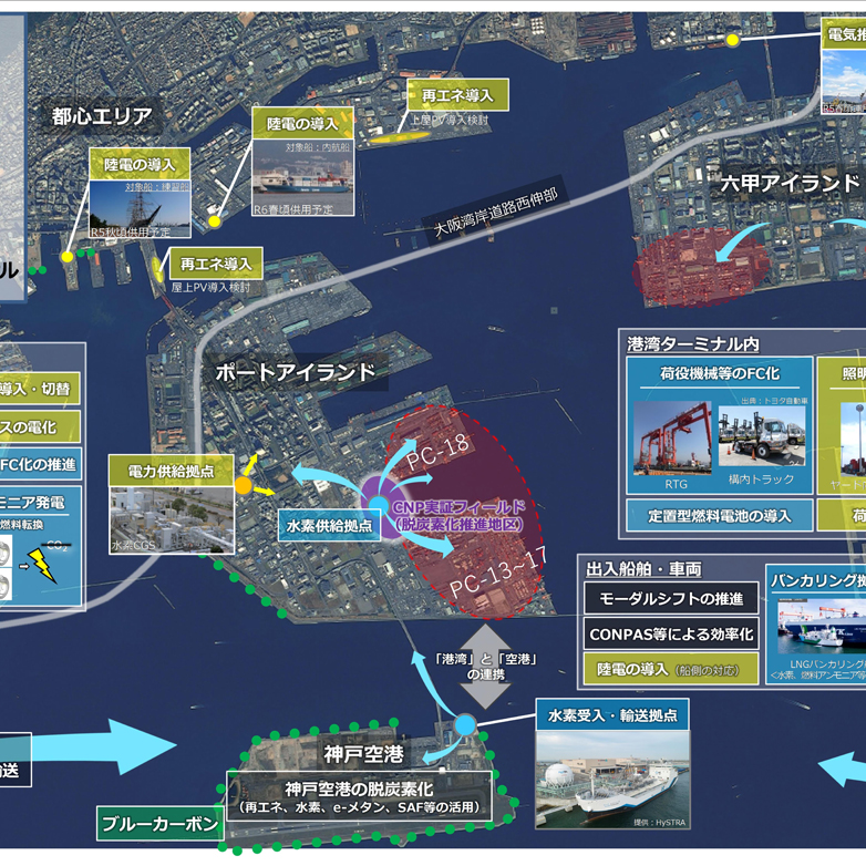神戸港では、世界の荷主や船社から選ばれ続ける港湾を目指し、ポートアイランド第2期のコンテナターミナルの拡張等により機能強化やカーボンニュートラルポートの形成を図っています。PC-13~17のコンテナターミナルは、拡張後、神戸港の外貿コンテナの約4割を取り扱う西日本最大規模となるとともに、水素を活用した港湾荷役機械の導入など、環境に配慮した効率的なターミナルとなる予定です。また、停泊船舶への陸上からの電力供給設備の導入も進めており、CO2を排出しない「カーボンニュートラル」の実現に向けて取り組んでいます。