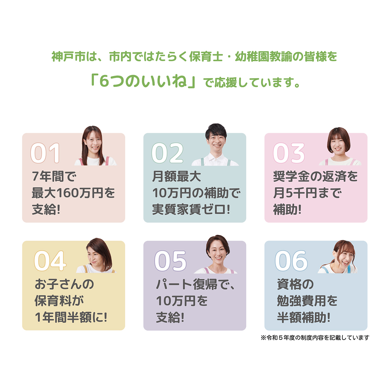 保育人材確保「6つのいいね!」 2023年11月1日 待機児童の解消・保育人材の確保に向けて、民間保育所・認定こども園等の保育士・幼稚園教諭の処遇を神戸市独自に抜本的に改善しています。2023年度は、採用後7年間で最大160万円の一時金を支給するほか、最大月額10万円の家賃助成、年間6万円までの奨学金返還支援など、「6つのいいね」で応援しています。