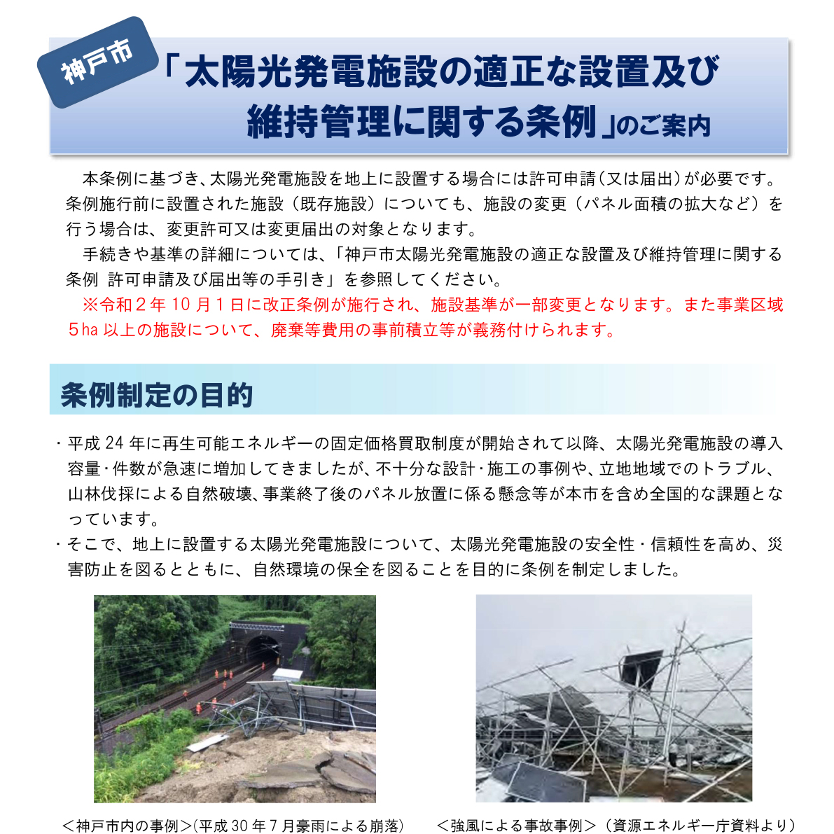 太陽光パネル規制条例 2023年11月9日 太陽光発電施設が急速に整備される一方で、不十分な設計・施工の事例や地域とのトラブル、自然破壊、事業終了後のパネル放置などの問題が全国的に顕在化しました。そこで、2018年12月に神戸市独自に、太陽光発電施設の設置基準や管理状況の報告を義務付ける「神戸市太陽光発電施設の適正な設置および維持管理に関する条例」を制定しました。また、2020年7月には撤去費用の事前積み立ての義務付けや排水対策など規制を強化する改正を行いました。