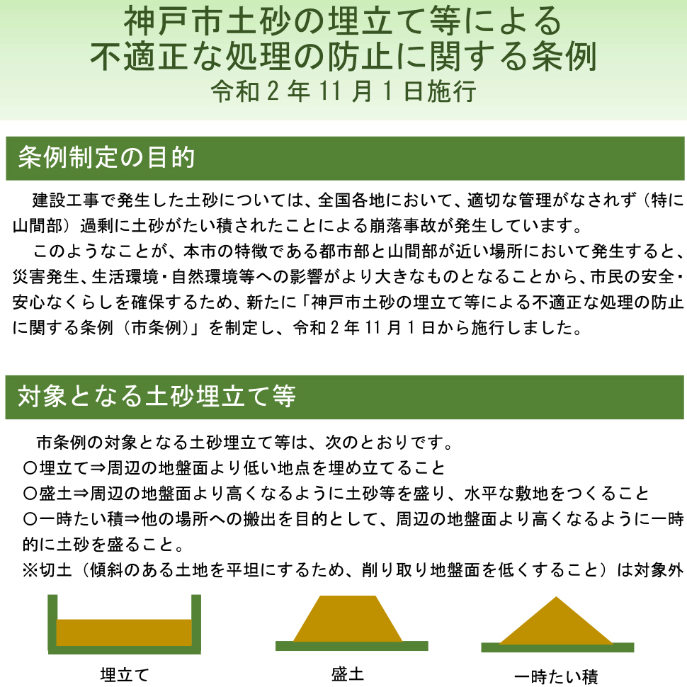 先進的な土盛り対策条例 2023年11月2日 土砂処分で発生しうる過剰な堆積、廃棄物等の混入、自然環境への無配慮といった不適正な処理を未然に防止するため、2020年6月「神戸市土砂の埋立て等による不適正な処理の防止に関する条例」を制定しました。災害発生に備えた保証金制度の創設、環境影響調査の導入、水質検査の義務化など、先進的な規制を導入しています。